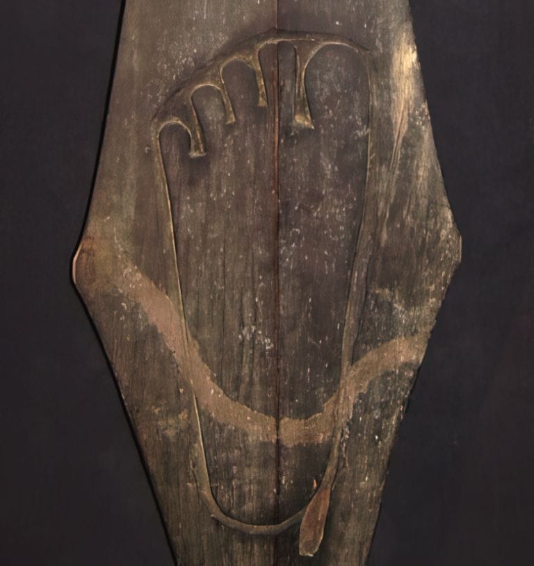 Un pied est gravé en bas relief sur cette pagaie du culte des ancêtres qui fait fonction de kirekat (planche des ancêtres) et appartenait à la personne défunte. Photos (N° 1, N° 2, N° 3)