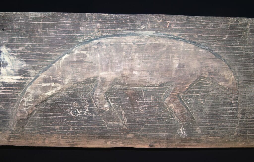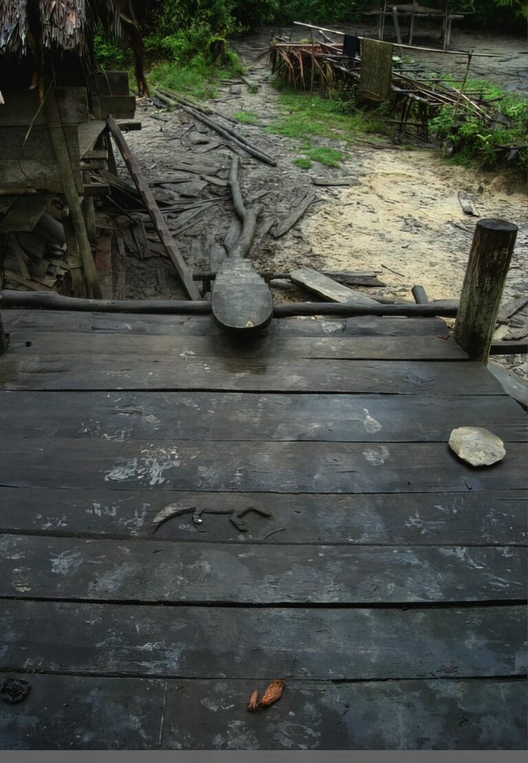 Ce panneau à motif de pangolin était un élément du plancher de la terrasse d’une lalep (maison), c’est un tableau de chasse. Le chasseur n’a le droit de représenter les animaux que si il les à tués. Cette représentation garantit une certaine abondance dans les chasses futures en s’attachant l’âme de cet animal devenu totem.